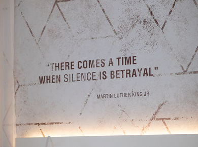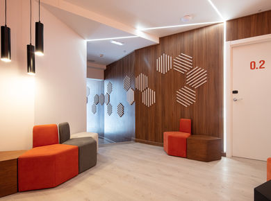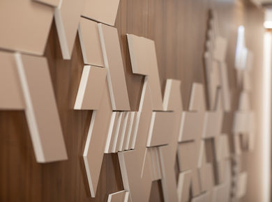 As linhas de iluminação embutidas nos tetos e paredes dos corredores que entrecruzam o interior do espaço, guiam os visitantes numa consistente relação visual com a representação gráfica do logotipo.