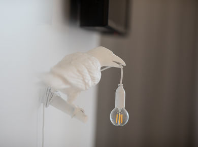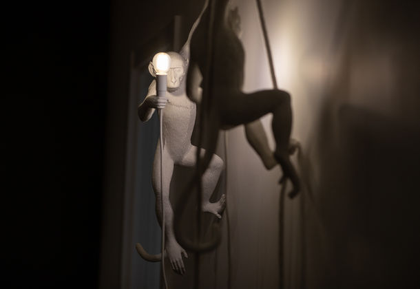 Pequenos primatas iluminados que se encontram distribuídos pelos espaços, para além de leves apontamentos humorísticos, concedem um forte impacto teatral criando a cenografia perfeita.